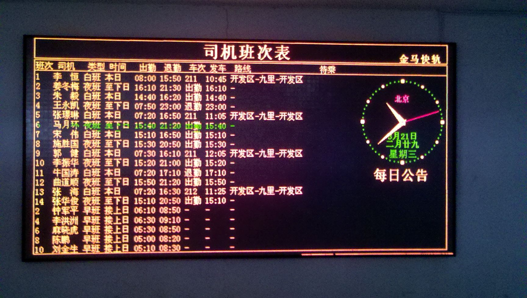 大屏幕及查詢系統滿足地鐵列車運營時刻表和司機相關作業規定的需要,動態掌握司機狀況,自動生成合理的司機出乘計劃,使派班管理員減少重復勞動,提高工作效率。同時避免人為因素出現的計劃編制差錯,實現對司機的科學、規范管理。